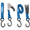 The Yamaha Ratcheting Tie Downs are 1" x 10' with 1" rubber handle ratchet.