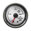 This two-inch, backlit, analog gauge monitors outboard water pressure in PSI, to alert you to possible overheating. It features a modern faceplate design, and comes in either a chrome bezel with black, silver or white faceplates, or a black bezel with a black faceplate.